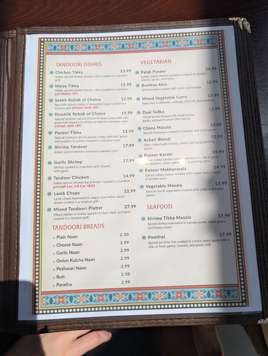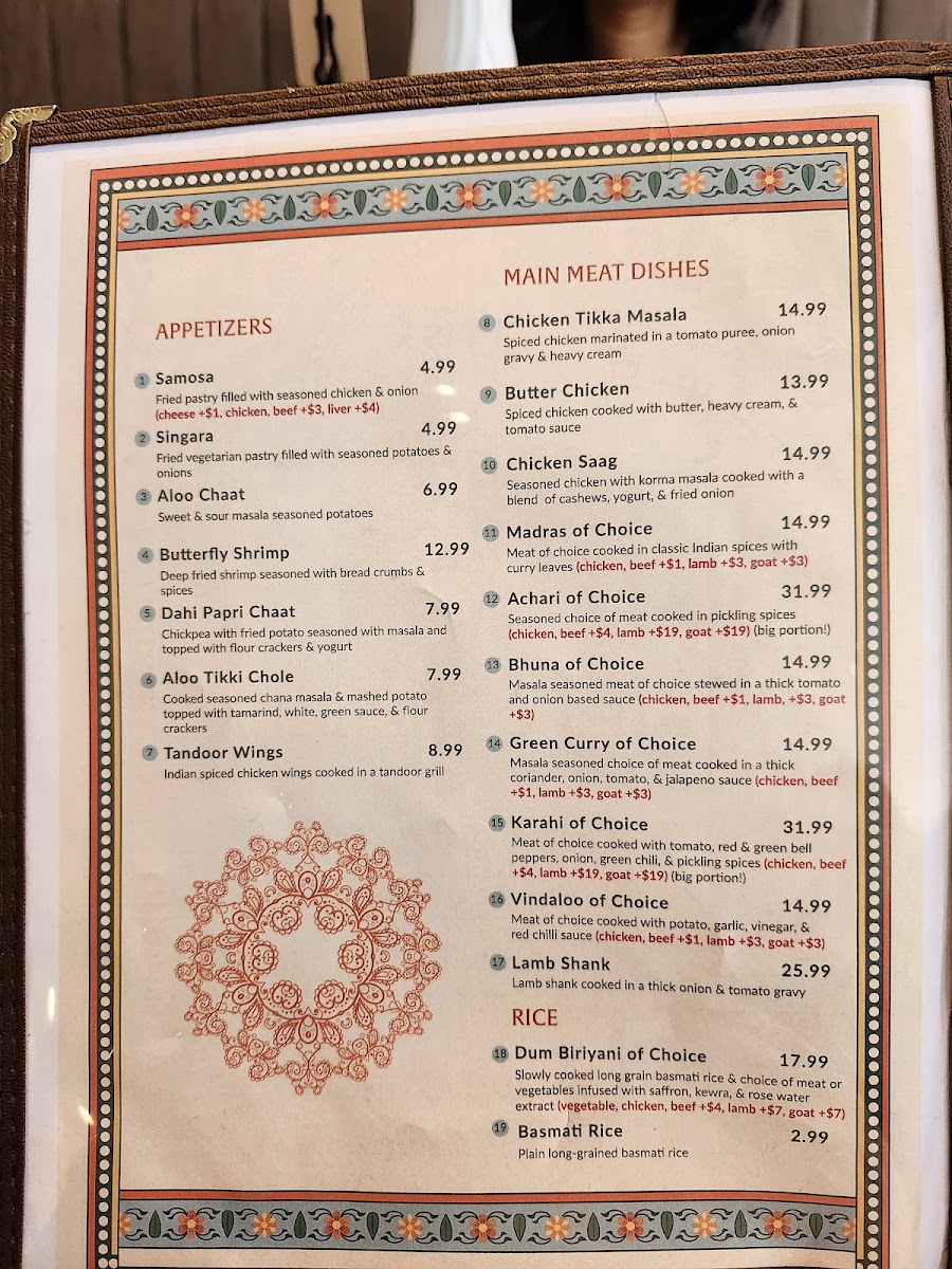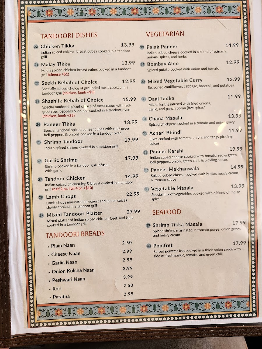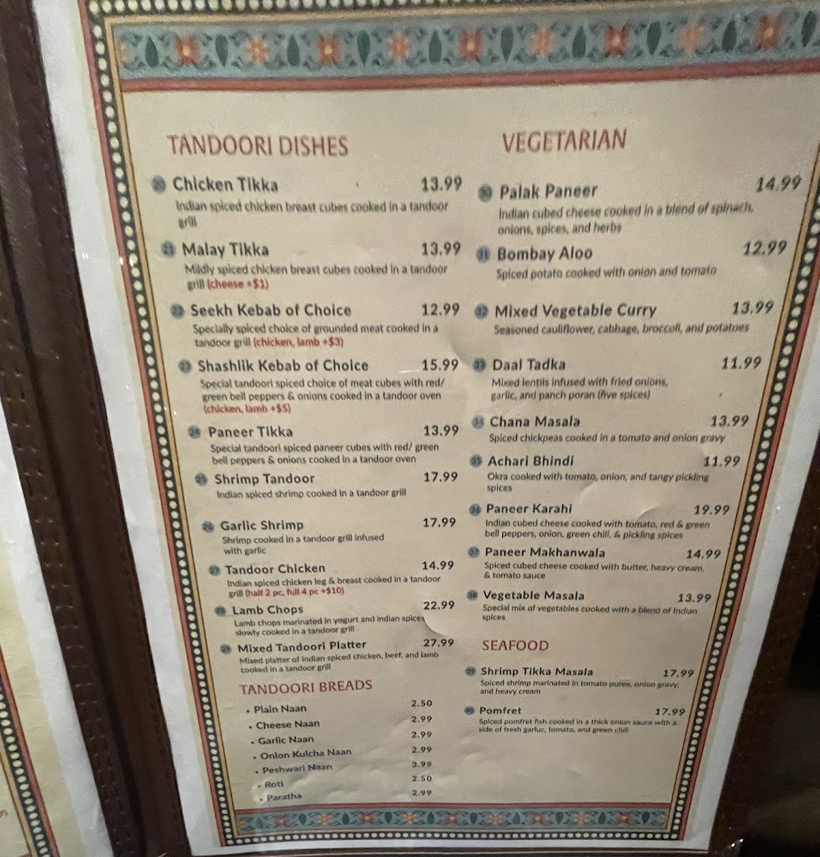 “ The food was excellent and so was the professional courteous services. Prices were very reasonable. The entire restaurant was very clean and had a nice ambience!!! I had chicken Tikka with Roti and it was sizzling delicious. My friend had Chicken Marsala, the sauce was the best I've ever tasted, creamy and spicy and tab bit of zing to it. Scale 1-10: Food-9 Price-9 Service-10 Atmosphere-8 Cleanliness-9 ”